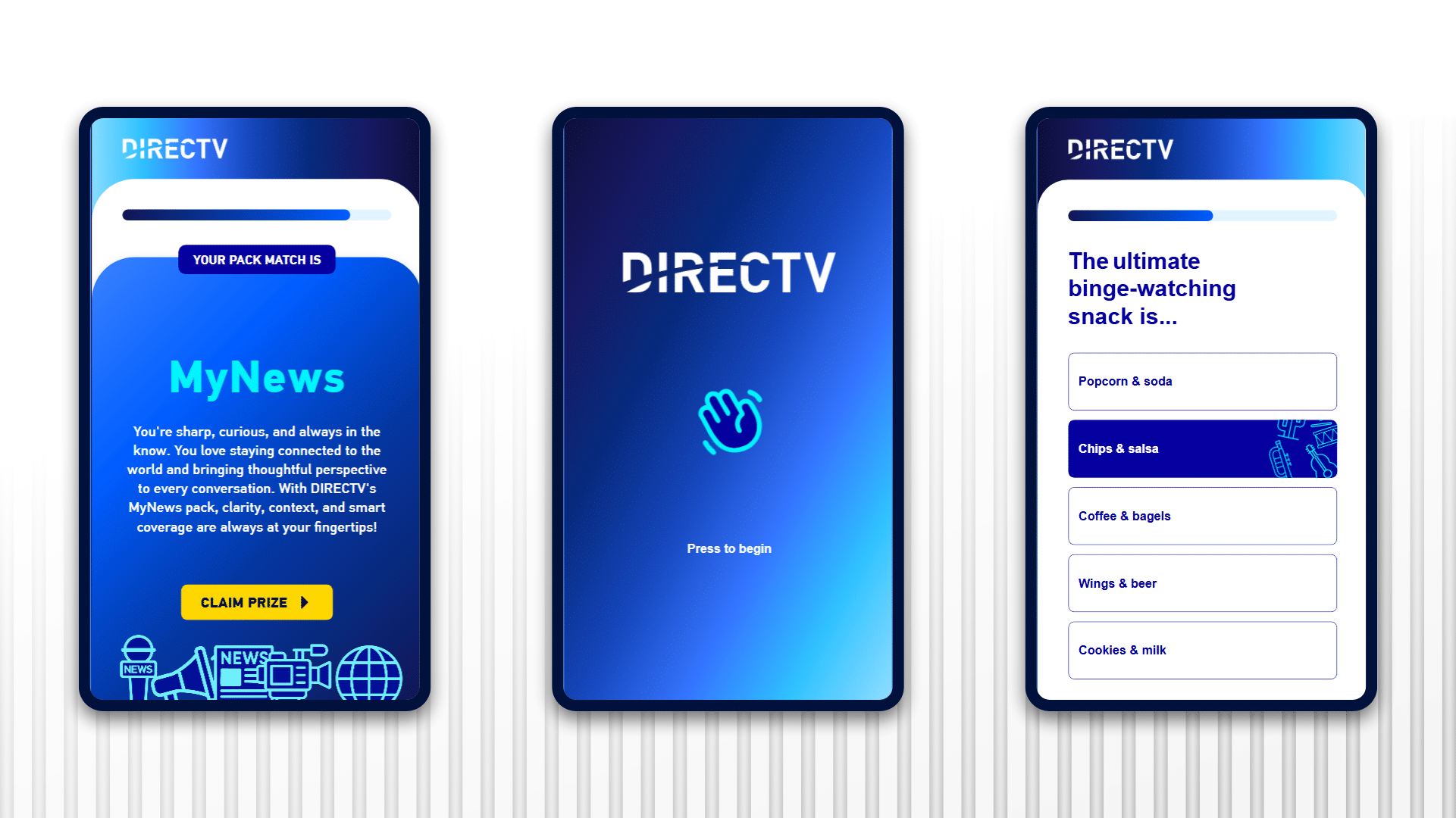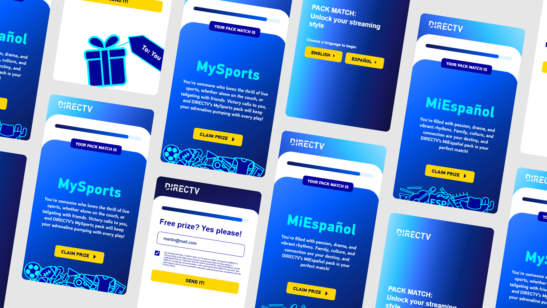Design and development of an interactive web experience based on an animated quiz to showcase DirecTV’s media packages. It included a landing page with user registration, dynamic questions, personalized results, and integration with automated email delivery and Google Analytics.
